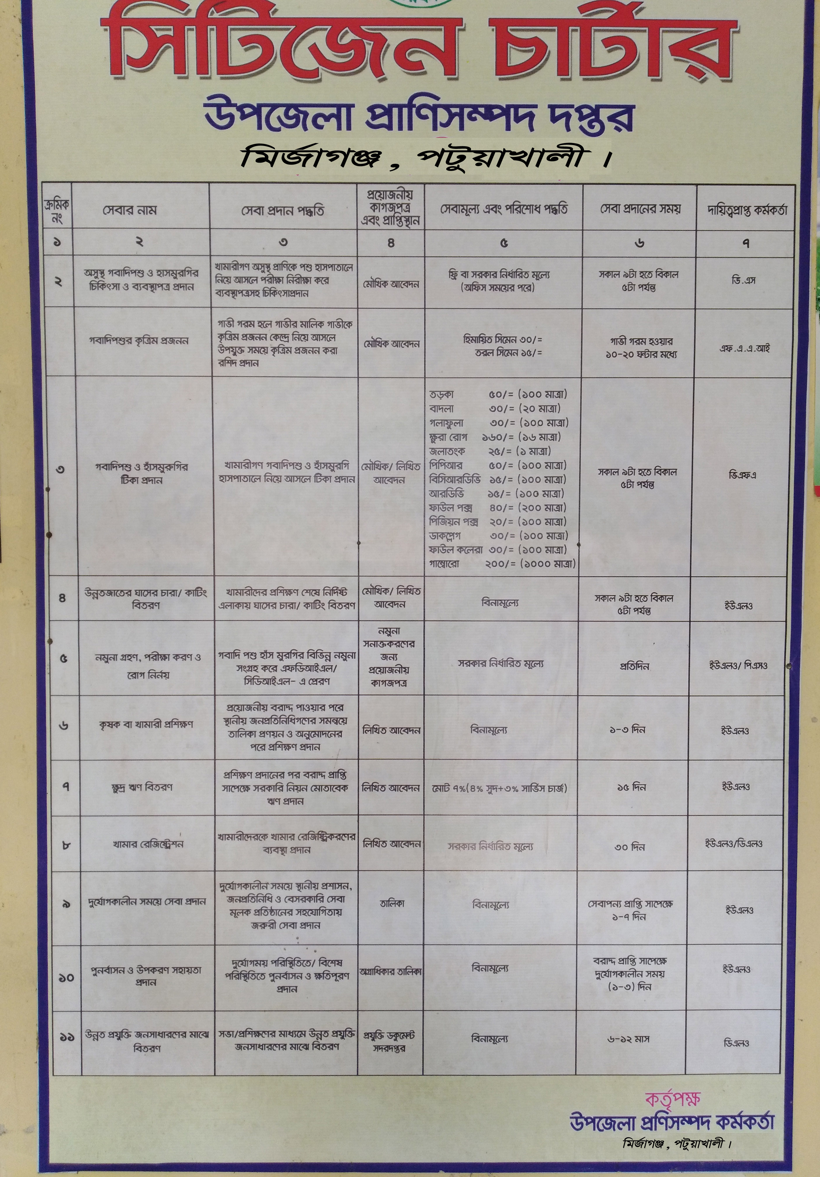 | ০১ | অসুস্থ পশু ও হাস মুরগীর চিকিৎসা ও ব্যবস্থাপত্র প্রদান ক) হাসপাতালে খ) কৃষকের বাড়ী/খামারে/চেম্বারে গ)গবাদি পশু ও হাঁস-মুরগির নমুনা( গোবর রক্ত নমুনা পরীক্ষা ও প্রয়োজনবোধে আঞ্চলিক রোগ অনুসন্ধান গবেষনা গারে প্রেরন করা) |